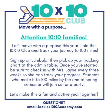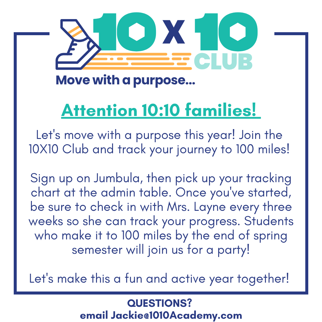 Please join us to the 10x10 Club - a challenge to have our students walk or run 100 miles this learning year.
