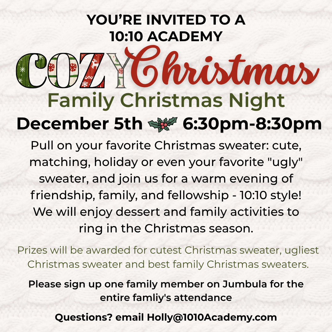 Pull on your favorite Christmas sweater: cute, matching, holiday or even your favorite "ugly" sweater, and join us for a warm evening of friendship, family, and fellowship - 10:10 style! We will enjoy dessert and family activities to ring in the Christmas season.