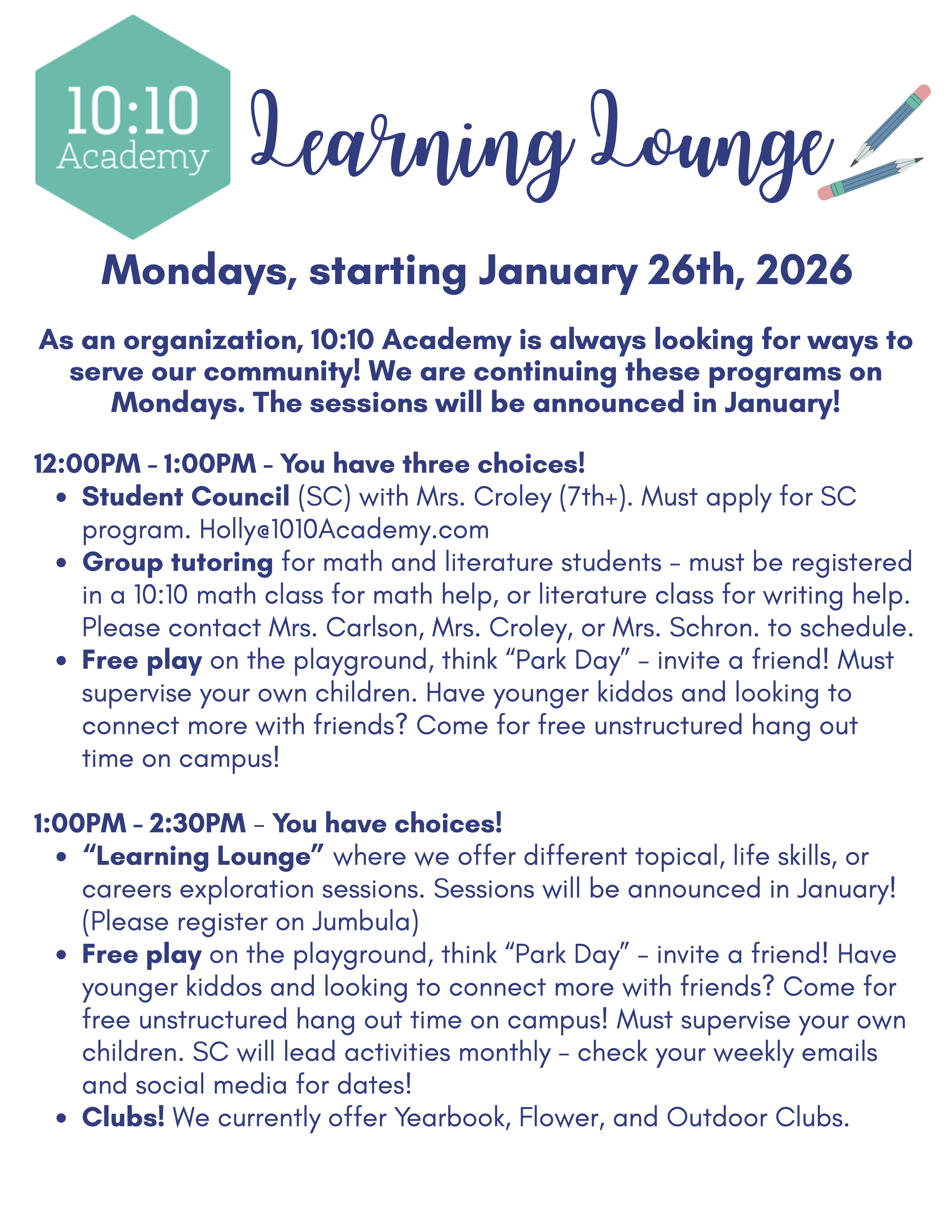 - Student Council (SC) with Mrs. Croley (7th+). Must apply for SC program. [email protected]